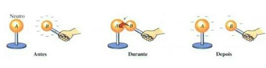 Eletrização por contato. Ocorre quando dois condutores-um eletrizado e outro neutro, por exemplo-forem colocados em contato físico entre si, através do contato os “elétrons livres” se encarregam de conduzir e redistribuir as cargas nos dois condutores.